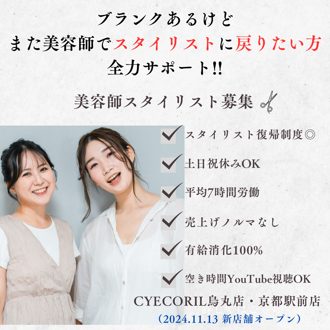Cyecoriには一度美容師をお休みして復帰に悩んだスタッフが実際に活躍してます。